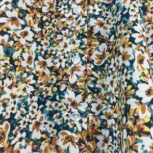 Multicolored floral pattern, cinch and tie sleeves, button up, v-neck, curved hem,extra button,colors may vary due to lighting, good used condition, 2X