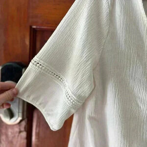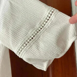 This beautiful white boho blouse is perfect for adding a touch of effortless style to any wardrobe. Great for pairing with jeans or skirts for a casual or semi-dressy look. The crochet lace sleeves and tie-front detail make it an ideal choice for fans of cottagecore, coastal chic, and summer fashion.