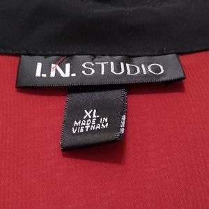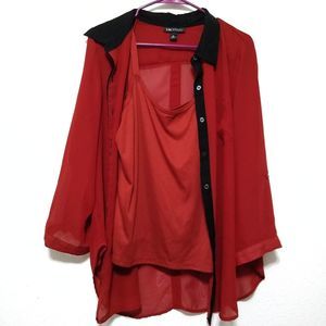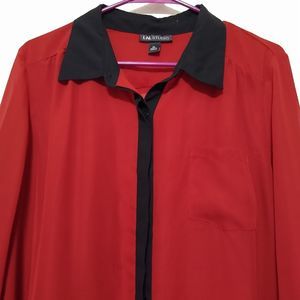 Great pre-owned condition. Gorgeous red sheer button down blouse with built-in tank features a black collar and button placket, roll tab sleeves and buttons down the back. Flowy tunic style blouse for any occasion. Smoke free, pet friendly home.