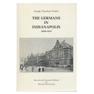 The Germans in Indianapolis 1840 - 1918, by George Theodore Probst. Paperback, approximately 6 3/4 by 10 inches, 210 pages, bibliography, indexed. Pre-owned item in acceptable reference copy condition, loose binding at Page 122/123, corner bumps, light soiling, no handwriting or markings, no tears.