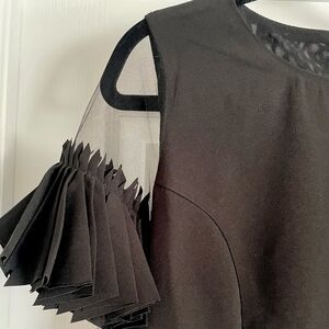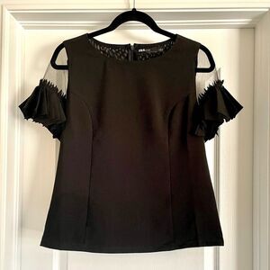 INA Black Semi Sheer Pleated Sleeves Ruffle Blouse SZ L