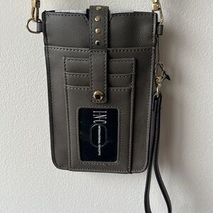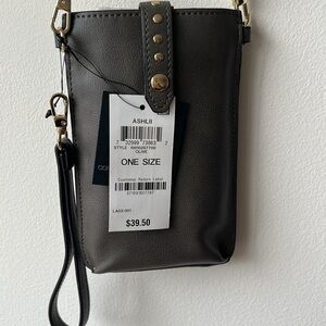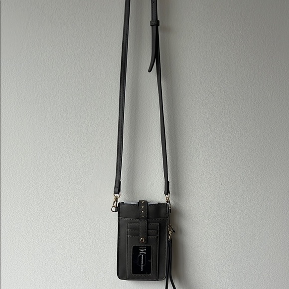 Stylish black crossbody bag. Features gold-tone hardware. Compact and versatile design.