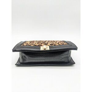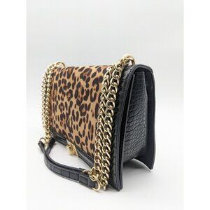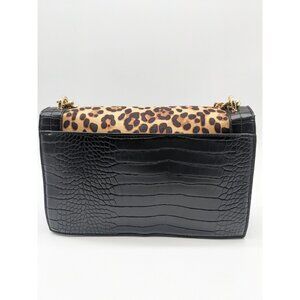 Black and leopard print faux-leather. Medium crossbody style. Chain link and faux-leather strap combo.