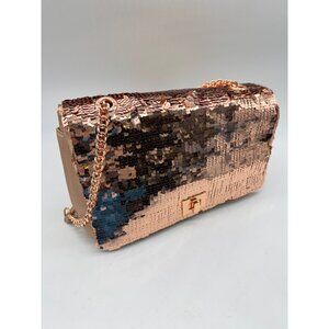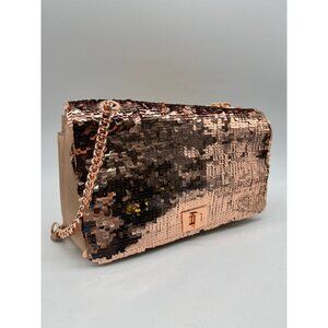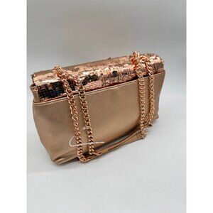 Rose-gold sequin. Medium crossbody style. Chain link and faux-leather strap combo.
