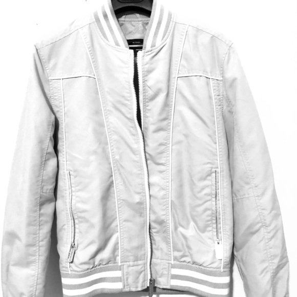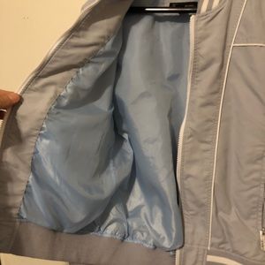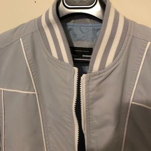 This is a an INC (Macy’s) Baumer Jacket, it’s white and a light grey color with a light blue lining, it has been worn no more than 8x
