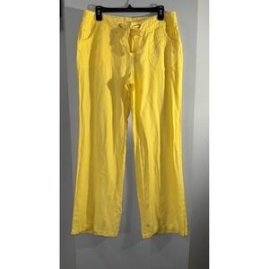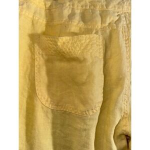 INC Beach wide leg relaxed linen pants. The pants are not as bright of a yellow in the fist photo. The other photos are more accurate. 100% linen pants. Front patch pockets with open loose pockets on the back. Drawstring waistband in a size 12. The waist measures approximately 18" across rise of 10" and inseam of 31"x all measurements are approximate. Excellent condition with the exception of the two spots on the back pocket. They are untreated and will come out with clean when washed.