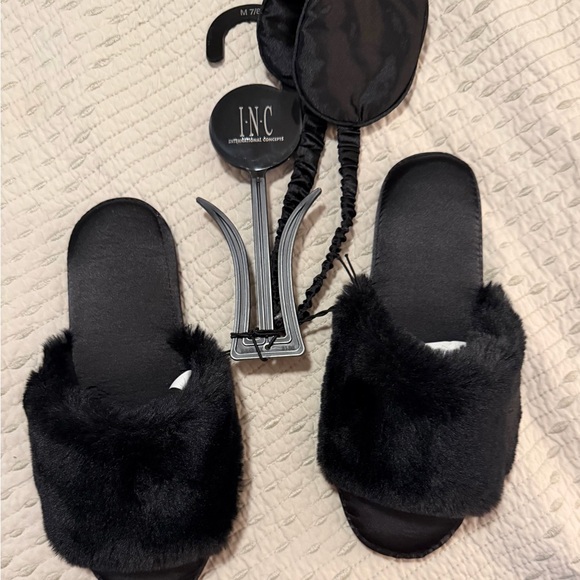 INC Black Faux Fur Slippers and Sleep Mask Set