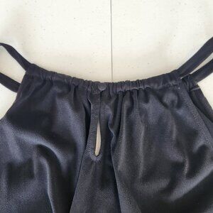 This is an I.N.C. International Concepts black crepe halter top embellished with colorful sequins in floral patterns,. The hem is gathered with elastic into a blouson or bubble hem. The neckline is gathered with a small opening in front and aovered button on back. The fabric on the back is solid black and stretchy. This top can be dressed up with black slacks or dressed down with jeans. Accessorize with your favorite crystal earrings and a rhinestone bracelet!