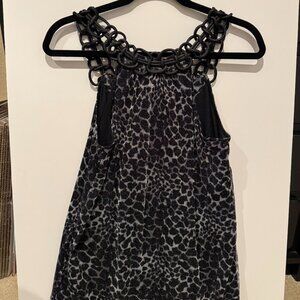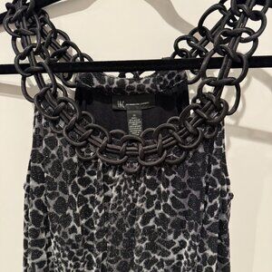 Chain link style neckline on a black metallic animal print sleeveless top. Really cute on with no known flaws. Probably worn once or twice. Hits at top of hips and has a lot of stretch. Size Medium. Fully lined.
