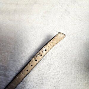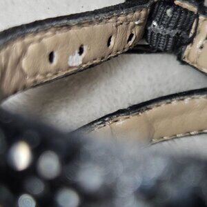 Minor scuffs ankle strap. Heel height = 5 inches. Platform height = 1 inch.