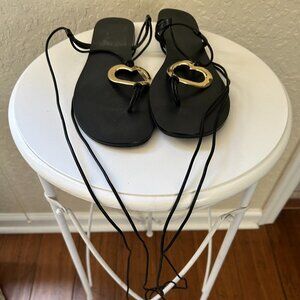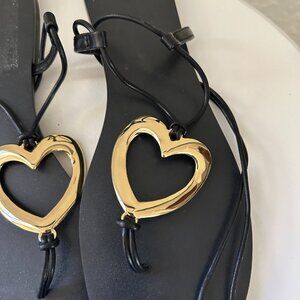 Pair of black strappy flat tie up sandals with gold metal heart-shaped upper embellishement.