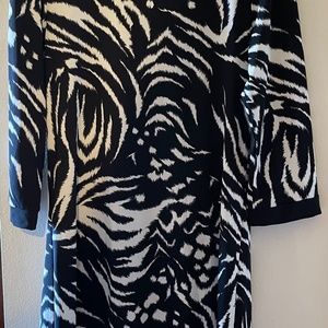 INC Black and White Animal Print 3/4 Length Sleeves Loose Knee Length Dress. Fun and flirty peek-a-boo V at the neckline. Extremely comfortable, easy care size M. A polyester and spandex mix, machine wash, with no wrinkling. Barely worn, and in great condition.