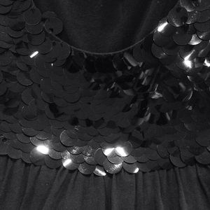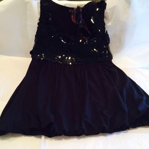 Fantastic INC black sequenced sleeveless dressy tunic top! holiday/party. Sequence discs bodice with bubble hemline. extra discs Included. Size Medium. Made of rayon/ spandex. ๐