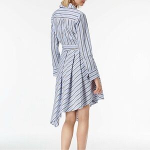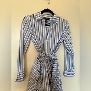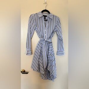 Beautiful asymmetrical dress with self tie and belt loops. Blue, white, and black stripes. Shirt dress style. Button down top and flared bottom. Great piece for work or professional events. Great on its own or paired with a blazer or cardigan. Lightweight.