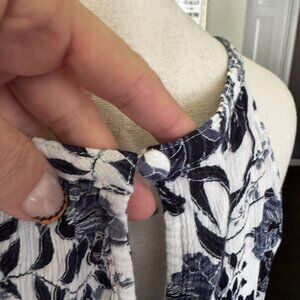 INC. Summer top in white with navy blue pattern. Faux "wrap" cross over front, with wide smocked elastic at the waist. Fastens at back of neck with a covered button and elastic loop. Comfortable, soft, breathable fabric. Size Medium, excellent used condition.