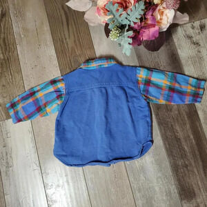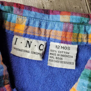 INC Boys Blue and Rainbow Plaid Button Down Shirt Size 12m 100% Cotton