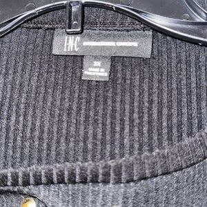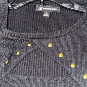 Perfect for a chilly night out on the town! Never worn, short sleeve, crew neck black sweater with angled panels that show cleavage. Gold rivets down each side. Not too heavy, light weight and comfortable. Women's plus size 3X (22W/24W) by Inc. International Concepts by Macy's.