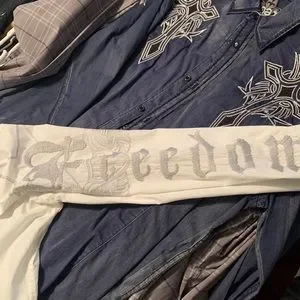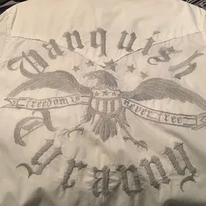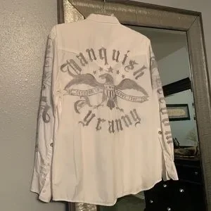White INC button up shirt with the inscription of “Freedom” “or Death” on the arms and “Vanquish Tyranny” and “Freedom is never Free” on the back. EUC No smoking home.