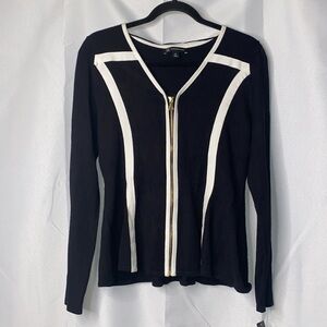 Vertical stripes of colorblocked trim create high-contrast style in this cool zip-front cardigan.