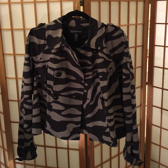 Smart, well-constructed, cotton blend, animal print fabric in black and silvery grey, cropped jacket featuring 3/4 sleeves with banded cuffs and shoulders and double-breasted front, punctuated with large, oversized, statement buttons in solid black. Super cute and versatile, translates easily from office to evening.