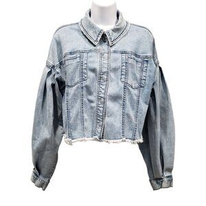 Description: INC Cropped Raw Hem Denim Jacket Balloon Sleeves Distressed Drop Shoulder 90s Size M