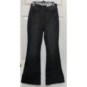 INC Denim Jeans Women's High Rise Flare Black Wash Rhinestones Studded at front