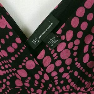 @jcmtess, hi there. Per an INC size chart a Large fits 12-14. The stretchy material is 100% Rayon. Length from shoulder to hem is 35".