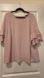 Elegant blouse featuring dramatic tiered ruffle sleeves. Round neckline with a relaxed silhouette. Soft dusty pink fabric perfect for dressy casual wear. Smoke free home