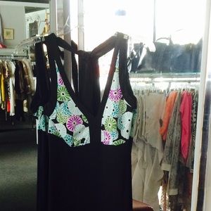 Black floor length halter dress with blue, green, white and purple floral print at the bodice. Made of 95% polyester / 5% spandex. Perfect for summer parties!