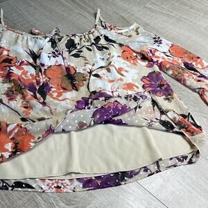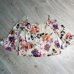 INC Floral Cream Purple Cold Shoulder Long Bell Sleeve Blouse Women’s