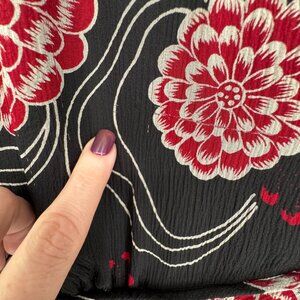 Elegant maxi dress with a flattering V-neckline and sleeveless design. Features a bold red floral print on a black background for a chic look.