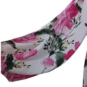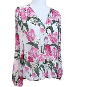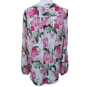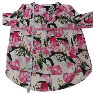 INC Floral Romantic Blouse Top L Pink Roses Green Leaves Split Sleeves Flowy