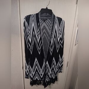 This is a black and white camisole made by I.N.C, International Concepts. Available in a size Large, this cover features a fringed hem line, 3/4" sleeves, and an open front.
