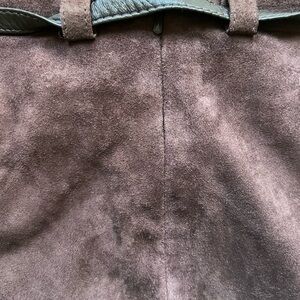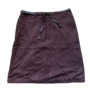 Description: genuine leather suede, chocolate brown, thin leather tie belt, career work, pencil skirt, zipper in back, modest/church skirt