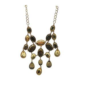 This bold gold-tone statement necklace features tiered teardrop and oval faux gemstones. Its intricate design adds sophistication to any outfit.