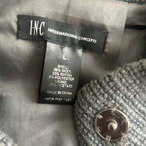 Stylish gray ribbed knit cape featuring a chic button closure. Satin lining. Wool blend. Perfect for layering. Smoke free home.