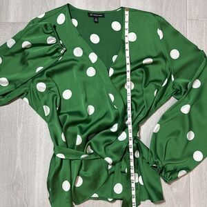 Elevate your wardrobe with this stylish INC International Concepts green polka dot wrap blouse. Designed with a flattering V-neckline and adjustable tie waist, this blouse offers a feminine, figure-enhancing silhouette perfect for work, brunch, or casual outings.