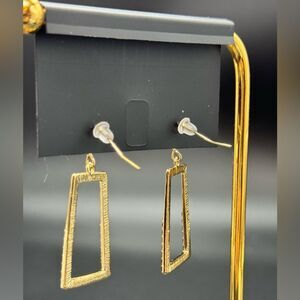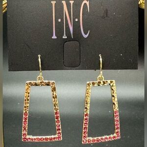 INC Hammered Gold Tone Open Rectangle W/ Red Crystal Fish Hook Earring