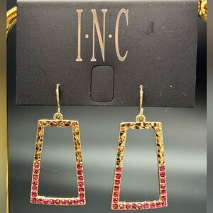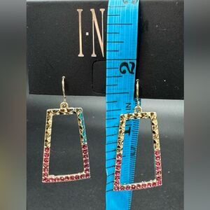 INC Hammered Gold Tone Open Rectangle W/ Red Crystal Fish Hook Earring 1.75 Inch