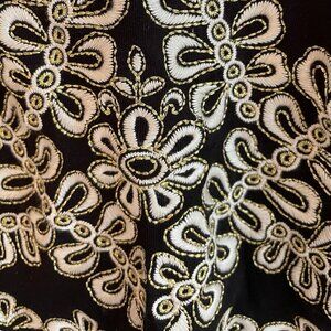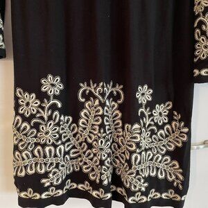 Black Knee Length Rayon V-neck Dress with White/Gold Embroidered Accents along the neck, cuffs and hem with Long Casual Sleeves for a Bohemian