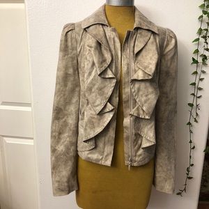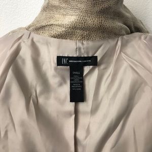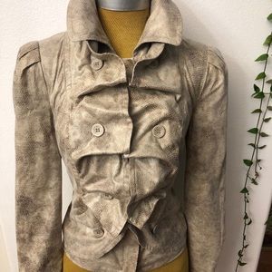 PREOWNED Sz small.I•N•C International Concepts ...super soft ...zip up ...faux suede jacket .. embossed snake skin print .. feminine ruffled front ...vanilla and taupe neutral color combo is stunning....silky lining ..can be worn for a casual and work blazer or for an outer wear jacket .. material is 100 % polyester ...great condition ..machine washable ..