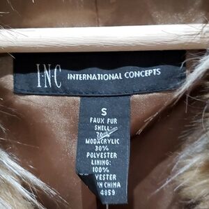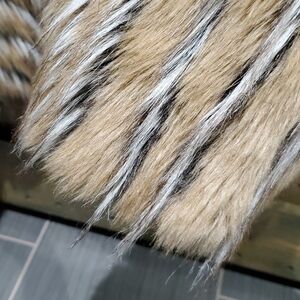 Super darn cute Macy's INC International concepts faux Fur striped short coat gorgeous fluff, open front with hook closures lining inside and out is pristine size small, shades of light brown, white, black pops with character, vegan