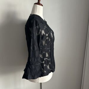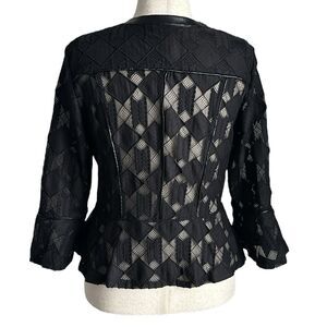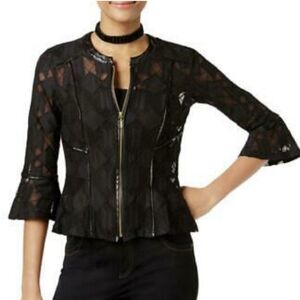 INC Int. Concepts Lace Patchwork Embroidered Zip Front Bell Sleeve Stretch Top Blouse Black Size L