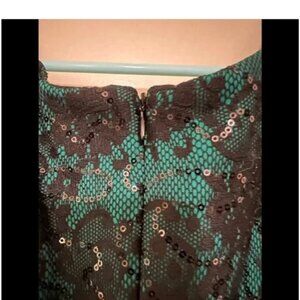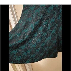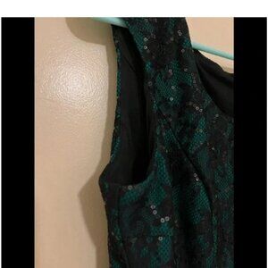 Perfect Party dress! Gorgeous Emerald Green dress with Black lace overlay and black sequins embroidered throughout. Sleeveless, Scoop neck, zippered back and lined. Fit and flare style with midi length.