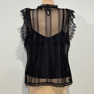 Unleash your inner romantic with this stunning lace top & camisole liner. Intricate floral lace creates a captivating visual texture, while the mock neckline adds a touch of sophistication. The sleeveless design keeps you cool and comfortable, and the delicate eyelash trim adds a touch of whimsy. The built-in camisole provides coverage and ensures a smooth silhouette. This top is perfect for a night out, a special occasion, or adding a touch of elegance to your everyday wardrobe. The camisole is snapped in, so its easy to replace with any other garment you choose.