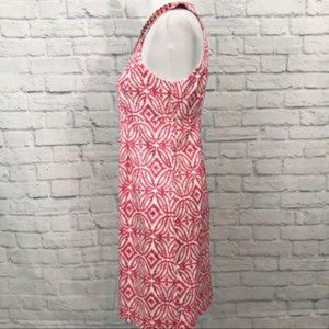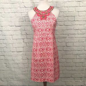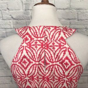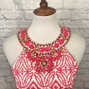 Excellent Condition INC International Concepts Coral and White Print Beaded Halter Dress. Center back zip with button closure at neck. Fully lined. Super versatile. Tag size 8. Approximate measurements laying flat: armpit to armpit 17”, length shoulder to hem 36”.
