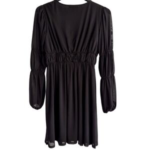 Beautiful black dress that is very flattering for all figures. The fabric is soft, fluid and flowy. The sleeves are sheer making the dress look extra special for an evening out.