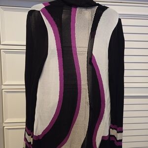 Stylish cardigan with striking black, purple, gold, and white patterns. Open front. Ideal for layering. In excellent used condition.