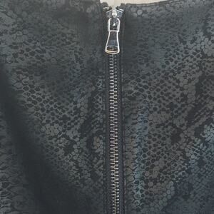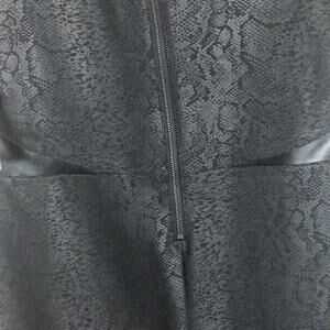 Key Words: Black Dress Printed with Lace Pattern that makes it look like Snakeskin has a Leather Insert around Waist; a Zipper with Hook from Neckline to Waist, V neck, and a 4" Slit in Back Hem