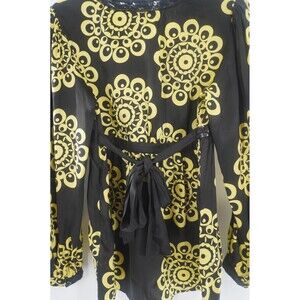 Pre-owned without tags INC International Concepts Black Yellow 100% Silk Sequin V-Neck Blouse Size 8. Add a touch of sparkle to your wardrobe with this stylish INC International Concepts blouse. This V-neck top features a striking black and yellow medallion/paisley print and is accented with subtle black sequin trim around the neckline and waist for a touch of glamour. Made from a luxurious 100% silk fabric, it offers a lightweight and elegant drape, with a loose fit that is both comfortable and chic. The blouse is versatile enough for various occasions, from a casual day out to an evening party.